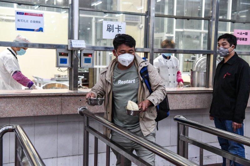 員工們下車(chē)集結(jié)之后,防疫工作人員依次為他們測(cè)量體溫并進(jìn)行消毒防護(hù)處理,指引員工們有序進(jìn)食堂就餐,然后回宿舍休息,為第二天安全復(fù)工做好準(zhǔn)備。